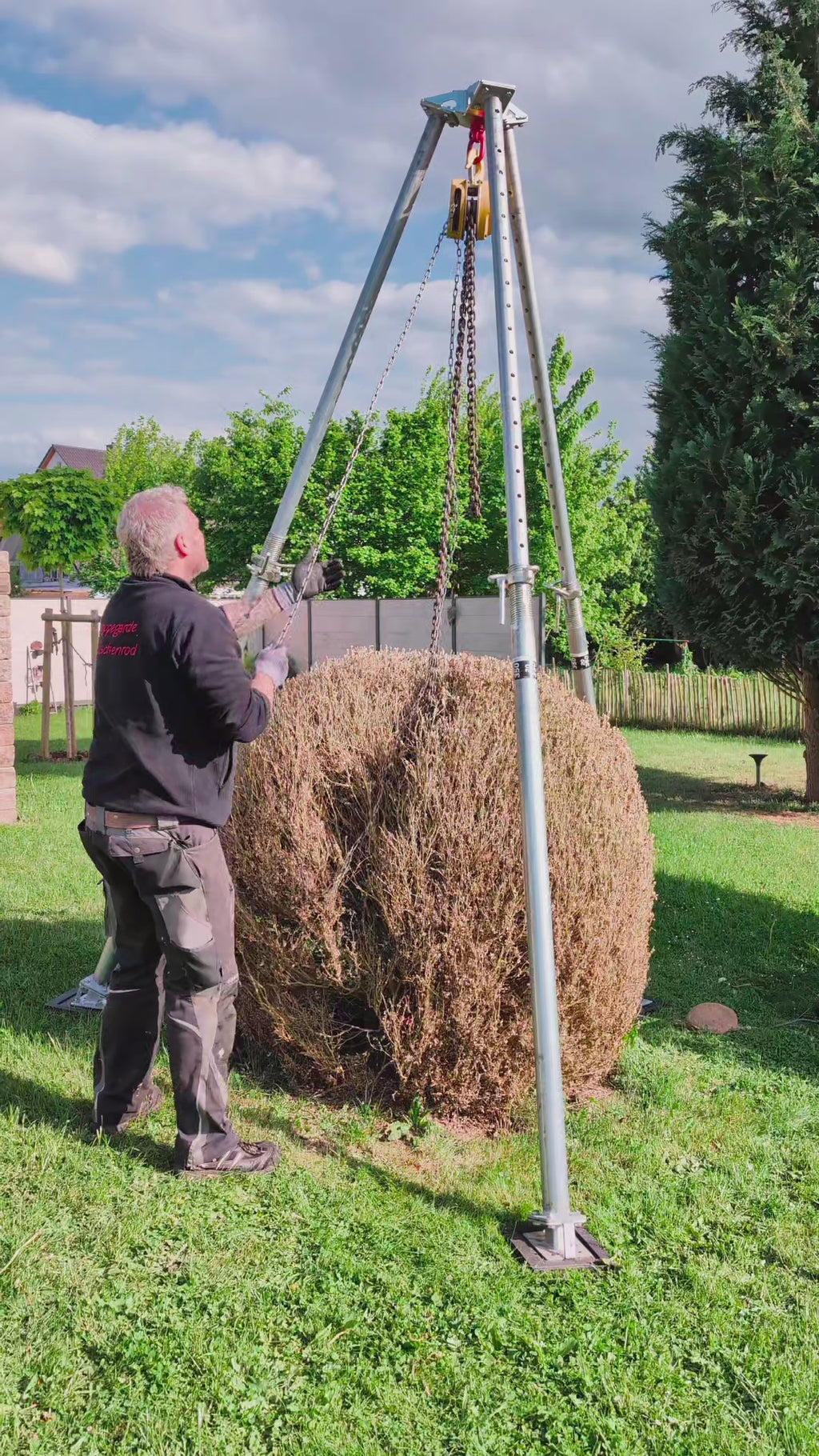Anders als Bagger oder schwere Maschinen hinterlässt Bautri Work keine zerfahrenen Rasenflächen oder beschädigten Beete. Das kompakte Dreibein kann direkt über der Wurzel platziert werden, sodass umliegende Pflanzen und Flächen geschont bleiben.